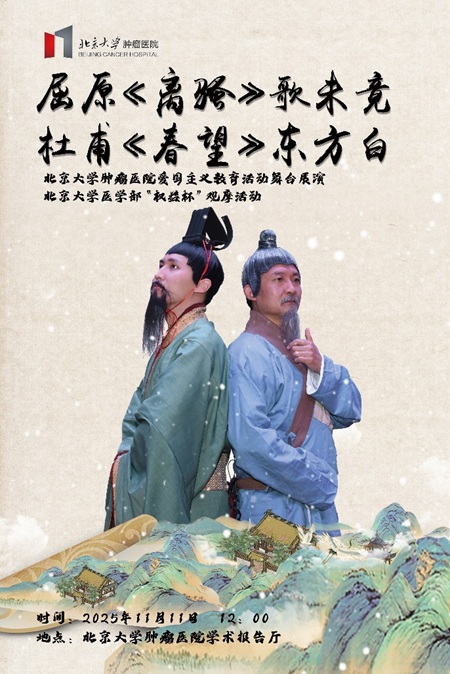 11月11日中午,北京大学肿瘤医院工会精心策划组织的“屈原《离骚》歌未竟,杜甫《春望》东方白”爱国主义教育主题舞台展演在医院学术报告厅圆满落幕。本次展演是医院2025年度爱国主义教育系列活动的收官重头戏,职工自编自导自演,以舞台艺术形式重现屈原、杜甫为代表的爱国人物事迹,传递深厚家国情怀,展现了我院昂扬向上、勇于担当的医院文化。