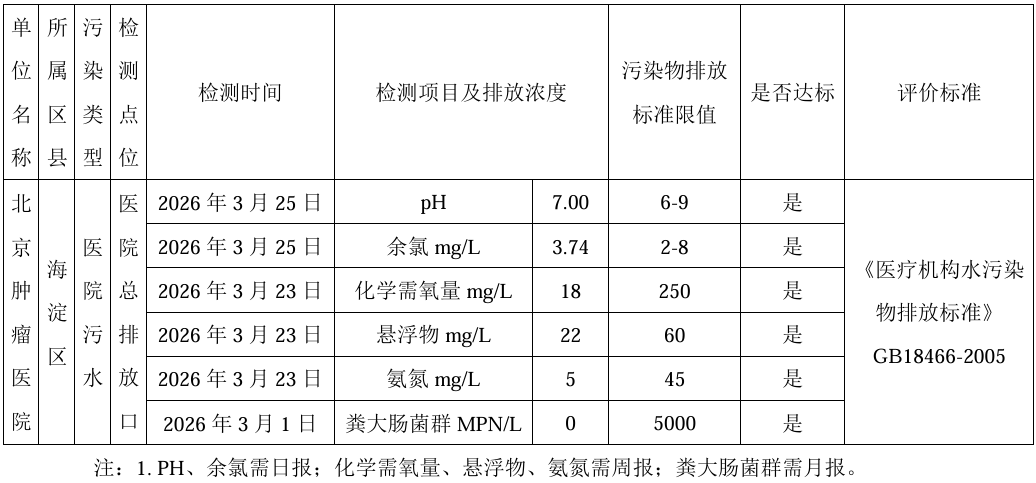 北京肿瘤医院污水处理监督性检测结果公开表