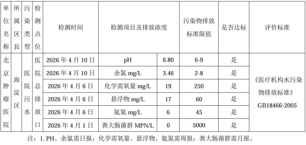 北京肿瘤医院污水处理监督性检测结果公开表