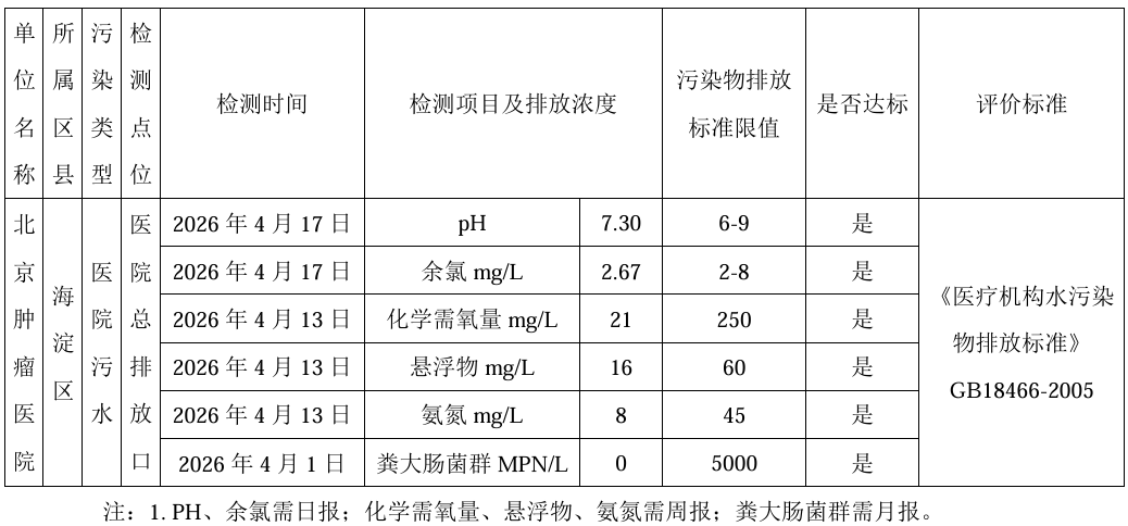 北京肿瘤医院污水处理监督性检测结果公开表