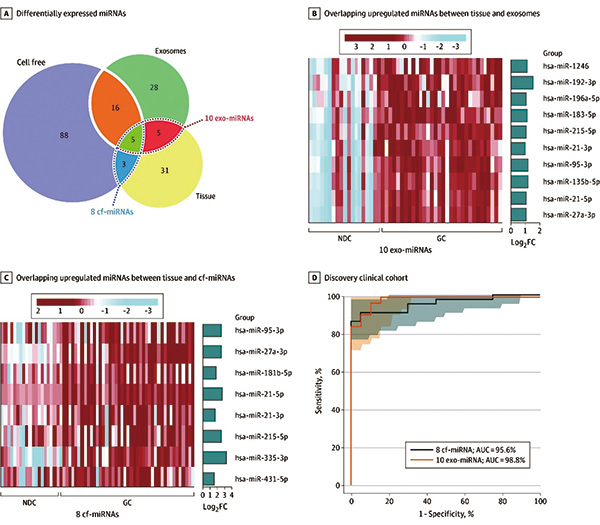 结果对来自训练队列和验证队列的480例患者(平均年龄61.9岁±9.8岁;336例男性)的809份样本进行了分析。在发现阶段最初开发了一组8种细胞游离miRNA和10种外泌体miRNA,在训练阶段使用机器学习算法将其缩减为一组8种细胞游离miRNA和9种外泌体miRNA。该17种miRNA标志在训练队列和验证队列中均能稳健地识别胃癌,曲线下面积(AUC)值分别为96.3%(95%CI 94.3%~98.4%)和 95.3%(95%CI 92.8%~97.9%)。此外,在游离细胞和外泌体检测板之间观察到5种重叠的miRNA,它们在识别胃癌患者方面表现出相当的效能。最后,研究者建立了一个10种miRNA标志组合(Destinex),成功识别了早期(pT1)胃癌(AUC=96.8%,95%CI 93.5%~100%)。最后,术后血清样本中miRNA表达水平的显著降低证实了该检测面板的特异性。 (编译 何毅)