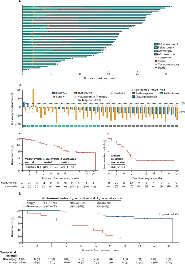截至2025年1月20日数据截止时,中位随访时间为19.5个月(IQR:14.6~25.0个月),R0切除率为63%(26/41,95%CI 47%~78%)。所有患者均至少发生一次任意级别的治疗相关不良事件(TRAE);20例(49%)患者发生3~4级TRAE,其中最常见的是中性粒细胞减少症(14例)。4例(10%)患者发生严重TRAE,包括中性粒细胞减少症(3例)和血小板计数降低(1例)。未发生与TRAE相关的死亡事件。