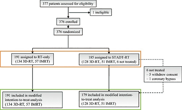 很少有研究比较STADT联合大剂量放疗(STADT-RT)方案与单独使用大剂量放疗(RT)方案在局限性前列腺癌中的应用。Ⅲ期随机研究GETUG14将376例患者随机分入RT组(191例)或STADT-RT组(179例),两组的放疗剂量均为80 Gy。STADT的治疗包括曲普瑞林每月方案联合氟他胺每日方案,总持续时间为4个月,从放疗前2个月开始。