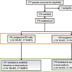 结果显示,改良的意向治疗人群有370例患者,其中241例(65%)患有中危前列腺癌,107例(28%)患有高危前列腺癌。存活患者的中位随访时间为84个月(IQR:62~99个月),RT组和STADT-RT组患者的5年DFS率分别为76%和84%(HR=0.64,95%CI 0.43~0.94)。添加雄激素剥夺治疗降低BF(HR=0.45,95%CI 0.28~0.72)和MF(HR=0.5,95%CI 0.23~1.11),但未改善OS(HR=1.22,95%CI 0.65~2.29)。