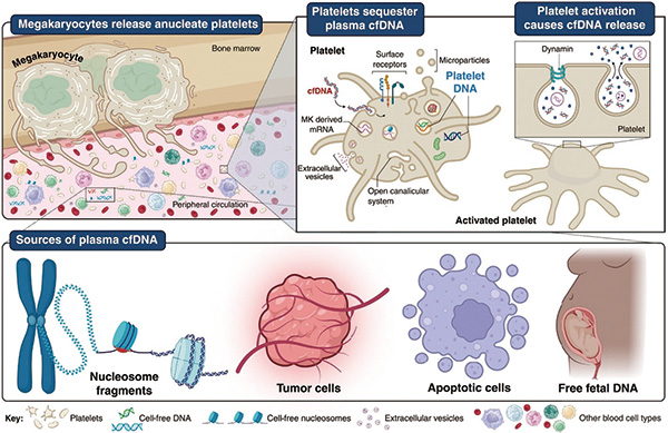 研究者分析了30名怀有男胎儿的健康孕妇血样,均在其血小板中检测到了Y染色体片段。研究者在小鼠中诱导了急性血小板减少,发现能显著增加血浆cfDNA浓度。提示血小板主动捕获循环中的cfDNA。体外实验中,血小板可在6分钟内饱和摄取DNA片段。循环中的DNA碎片很多样,有不足50 bp的超短链DNA,也可长达500 bp以上,或是与组蛋白结合或被细胞外囊泡包裹。