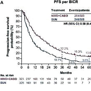 早期的结果显示,纳武利尤单抗联合卡博替尼在PFS、OS和ORR方面均显示出显著优于舒尼替尼的疗效。