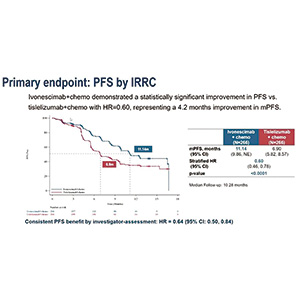 研究结果显示,与替雷利珠单抗联合化疗相比,依沃西单抗联合化疗的PFS获得统计学显著改善(HR=0.60,95%CI 0.46~0.78,P<0.0001)。经IRRC评估,依沃西单抗组和替雷利珠单抗组的中位PFS分别为11.1个月和6.9个月。