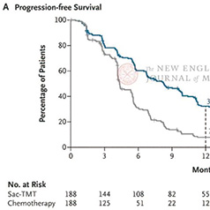 安全性方面,两组中3级或以上治疗相关不良事件(TRAE)发生率相近(58.0% vs. 53.8%)。最常见的3级或以上TRAE均为中性粒细胞计数降低(sac-TMT组39.9%,化疗组33.0%)。与化疗相比,sac-TMT组3级或以上贫血(11.2% vs. 14.3%)和血小板减少(2.1% vs. 16.5%)发生率更低。sac-TMT组口腔黏膜炎发生率更高(64.4% vs. 4.9%),但多数为可控级别。眼表不良事件多为轻中度,未报告药物相关间质性肺病或肺炎。患者报告结局显示,sac-TMT组在总体健康状况和关键临床状态恶化时间方面均优于化疗组,体现了其在疗效与生活质量方面的双重优势。
