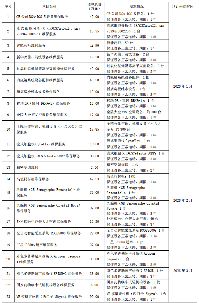 为便于供应商及时了解我院采购信息,保障我院采购需求调查工作开展,参照《财政部关于开展政府采购意向公开工作的通知》(财库[2020]10号)等有关规定,现将我院以下采购意向公开如下: