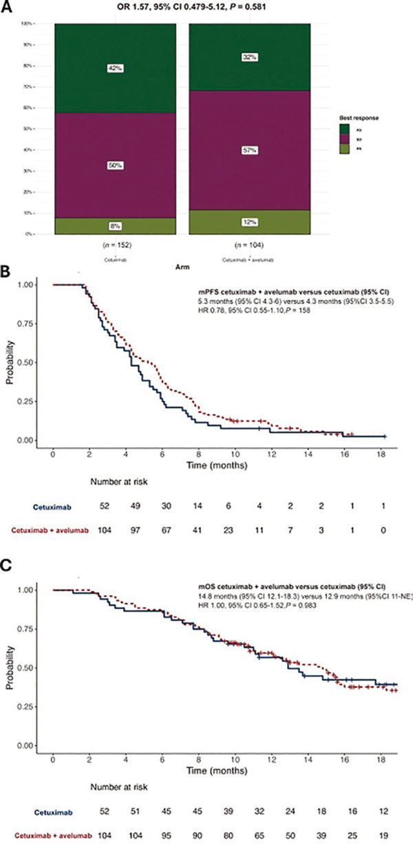 2022年8月至2024年12月,328例筛查患者中的156例被以2∶1的比例随机分配至西妥昔单抗联合阿维鲁单抗组(A组,104例)或西妥昔单抗单药组(B组,52例)。A组的中位无进展生存期为5.3个月(95%CI 4.3~6个月),B组为4.3个月(95%CI 3.5~5.5个月;HR=0.78,95%CI 0.55~1.10,P=0.158)。A组的中位OS为14.8个月(95%CI 12.1~18.3个月),B组为12.9个月(95%CI 11个月~未达到;HR=1.00,95%CI 0.65~1.52,P=0.983)。