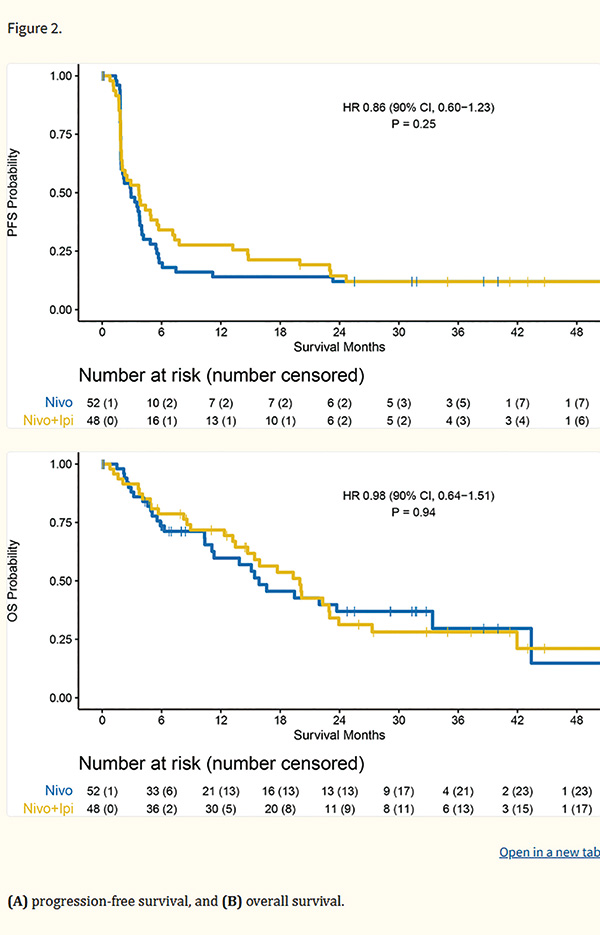 在这项Ⅱ期NCI ETCTN试验中,100例难治性、不可治愈的肛门癌患者被随机分配接受纳武利尤单抗单药治疗(480 mg静脉给药,每4周一次)或纳武利尤单抗联合伊匹木单抗治疗(伊匹木单抗1 mg/kg静脉给药,每8周一次)。主要终点是PFS。次要终点包括影像学缓解、OS以及≥3级不良事件。研究采用对数秩检验比较组间生存差异,单侧α为0.1,把握度90%;对基线和治疗期间收集的组织与血液样本进行了免疫生物标志物分析。