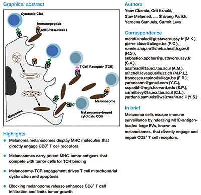 以色列研究者Chemla等研究发现,黑色素瘤特有的大型细胞外囊泡,黑素体(Melanosomes),可携带主要组织相容性复合体(MHC),通过T细胞受体(TCR)主动激活CD8阳性T细胞,导致T细胞功能障碍和凋亡。这是一种全新的免疫逃逸机制,通过抑制黑素体分泌能有效增强抗肿瘤活性。(Cell. 2026年1月8日在线版)