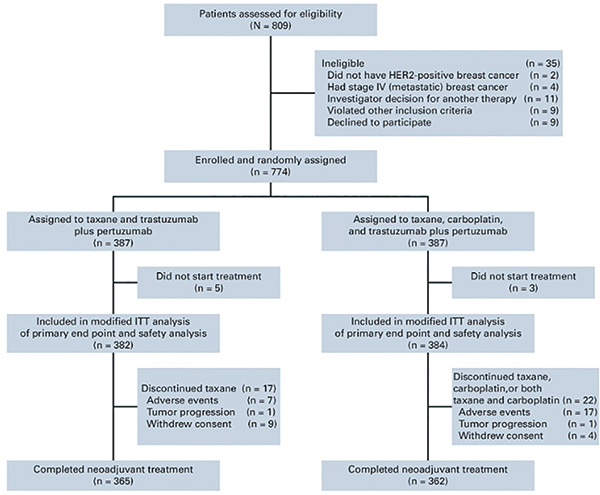 neoCARHP试验旨在在Ⅱ期和Ⅲ期HER2阳性乳腺癌患者中,评估在研究者选择的紫杉类药物(多西他赛、紫杉醇或白蛋白结合型紫杉醇)联合曲妥珠单抗和帕妥珠单抗的基础上,比较联合卡铂与不联合卡铂治疗的疗效和安全性。