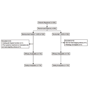 Ⅲ期随机试验S1826纳入新发的、Ann Arbor分期为Ⅲ期和Ⅳ期的cHL患者,比较了纳武利尤单抗、多柔比星、长春花碱、达卡巴嗪(N-AVD)方案与维布妥昔单抗、多柔比星、长春花碱、达卡巴嗪(BV-AVD)方案的疗效。