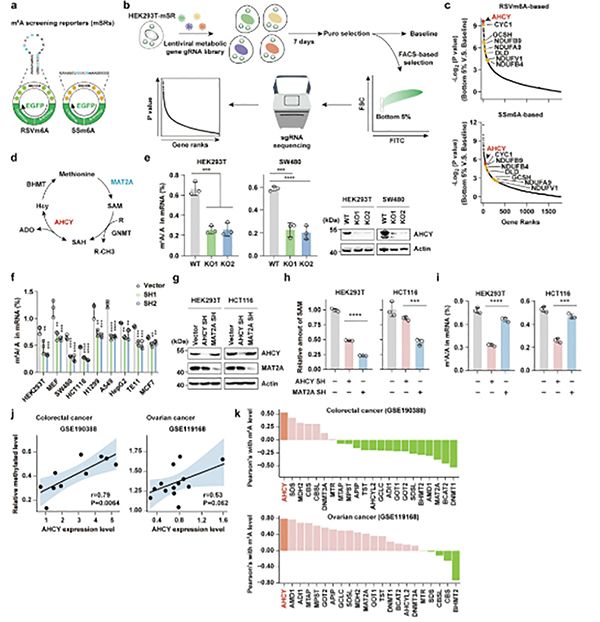 敲低或敲除AHCY能显著降低结直肠癌(SW480、HCT116)等多种肿瘤细胞中的m⁶A水平,而过表达AHCY则能使m⁶A水平升高。在AHCY缺失的细胞中,补充甲硫氨酸循环的多种代谢物(包括SAM)并不能完全挽救m⁶A水平的下降,而单独补充AHCY的代谢产物ADO却能显著提升多种细胞系的m⁶A水平。MAT2A作为直接催化SAM合成的酶,其缺失导致细胞内SAM水平严重下滑,m⁶A的水平下调却在AHCY缺失细胞中更显著,提示AHCY存在SAM非依赖的调控功能。