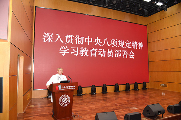 3月24日下午,肿瘤医院党委召开深入贯彻中央八项规定精神学习教育动员部署会。院党政领导、党委委员、各处室负责人、各党支部书记及委员、民主党派代表、离退休职工代表、教职工代表等参加会议。会议由院党委书记朱军同志主持,并进行工作部署。