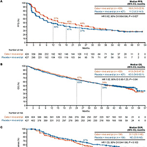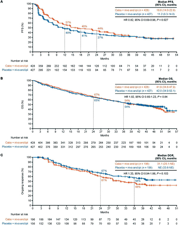 之前发布的主要终点结果显示,一线应用cabozantinib、纳武利尤单抗联合伊匹木单抗方案对比安慰剂联合方案显著延长了晚期肾细胞癌患者的PFS。