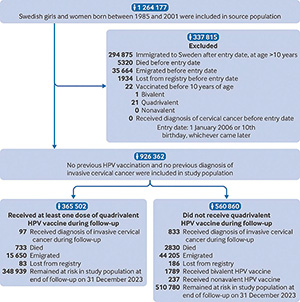 为探究四价HPV疫苗的长期保护效果,研究者开展了一项覆盖瑞典全国的队列研究。研究者利用瑞典的人口与健康登记系统,纳入出生于1985~2001年间、在2006~2023年间居住在瑞典的