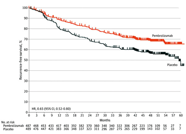 共有976例患者被分配接受治疗(帕博利珠单抗组487例,安慰剂组489例),其中589例(60.3%)为男性(诊断时的中位年龄为61岁,IQR为52~69岁)。中位随访时间为52.8个月(39.4~64.8个月)。