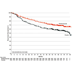 将新发原发性黑色素瘤计为事件时,帕博利珠单抗组的中位无复发生存期未达到,安慰剂组的为59.2个月(95%CI 53.9个月~未达到;HR=0.65,95%CI 0.52~0.80);48个月无复发生存率分别为68.7%和56.5%。帕博利珠单抗组483例患者中有16例(3.3%)发生了免疫介导的严重皮肤反应,安慰剂组的486例中有3例(0.6%)其中3级或4级事件分别有14例和3例。