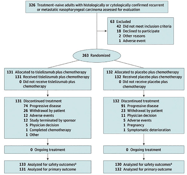 复发或转移性鼻咽癌的治疗选择有限。免疫疗法联合化疗已显示出希望,但需要长期数据来指导一线治疗选择。为了评估替雷利珠单抗联合化疗对比安慰剂联合化疗在复发或转移性鼻咽癌患者中的3年疗效和安全性,并探索治疗反应的潜在生物标志物,该项双盲、安慰剂对照Ⅲ期随机临床试验(RATIONALE-309)于2019年4月至2023年12月在亚洲纳入未经治疗的、经组织学或细胞学确诊的、复发或转移性鼻咽癌成人患者,等比分予替雷利珠单抗(200 mg q21)或安慰剂,均予吉西他滨联合顺铂方案治疗4~6个周期。联合安慰剂组患者在疾病进展时可转用替雷利珠单抗单药。