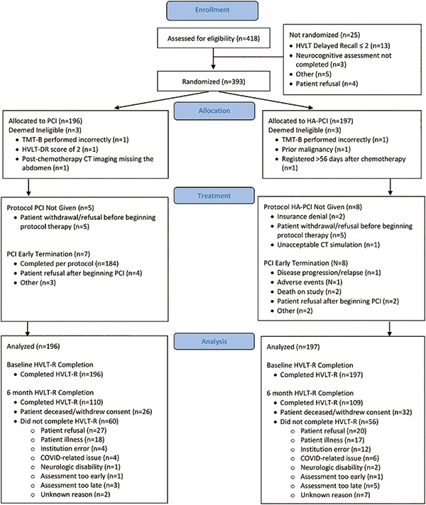 结果显示,2015年12月至2022年6月,随机分配393例患者(中位64岁)。疾病分期和美金刚的使用是平衡的。中位随访时间为17.0个月(所有患者)和30.8个月(存活患者)。HA-PCI组的12个月ICR率不劣于PCI组的,分别为14.7%和14.8%(P<0.0001)。PCI组和HA-PCI组患者的6个月HVLT-RDR恶化率无显著差异,分别为30.0%和25.5%(P=0.28)。