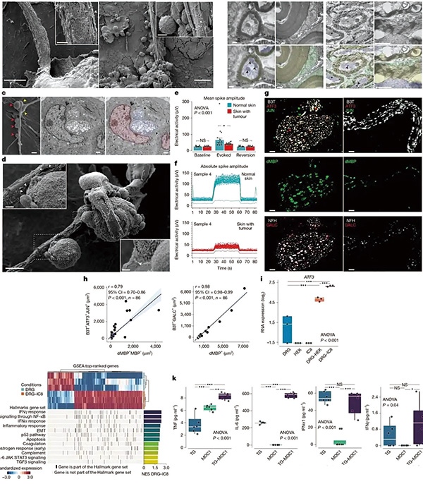 美国MD安德森癌症中心Baruch等,借助电子显微镜等技术手段,发现癌细胞其实可与神经元直接互作,降解神经纤维髓鞘,造成肿瘤诱导的神经损伤,受损的神经元会通过IL-6等免疫调节因子介导炎症促进神经愈合。在肿瘤的进展过程中,神经损伤不断发生,神经不停地启动愈合程序,由此带来的慢性炎症,导致肿瘤微环境陷入免疫抑制状态。(Nature. 2025年8月20日在线版)