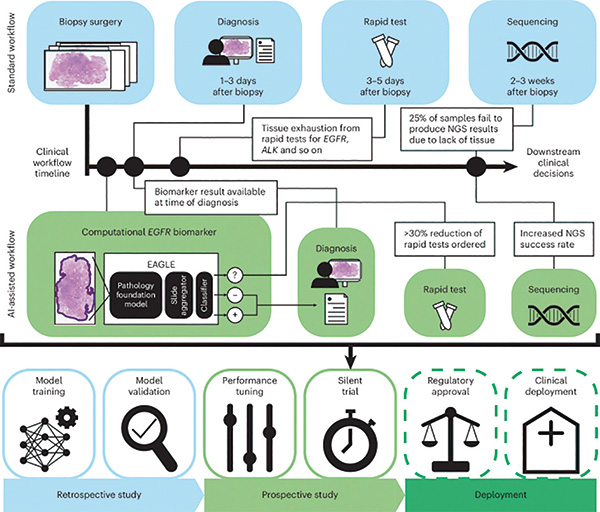 美国西奈山伊坎医学院Campanella等研发了名为EAGLE的AI模型,能基于常规病理切片检测EGFR突变,不用额外组织、不需分子实验室,耗时44分钟即可拿到检测结果。该AI模型不仅在回顾性数据中表现良好,在真实临床环境中测试AUC值达0.89。(Nat Med. 2025年7月9日在线版)