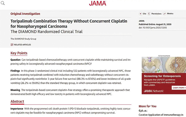 中山大学肿瘤防治中心马骏院士、孙颖教授等报告研究显示,在局部晚期鼻咽癌患者中,免疫治疗联合去同期顺铂放化疗方案是一种高效低毒、耐受性好的全新治疗之选,患者无失败生存期改善情况较好,且毒性低。(JAMA. 2025年8月21日在线版)