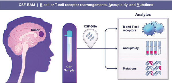 目前识别脑肿瘤的方法是侵入性的,并且具有潜在危险。其检测和诊断均需要侵入性较小的方法。研究者将多种生物标志物组合到一种名为CSF-BAM的多分析物检测中,可以观察B细胞和T细胞受体序列、非整倍体和肿瘤特异性基因突变,因此能检测出以脑脊液两条DNA链扩增为表现的中枢神经系统肿瘤。