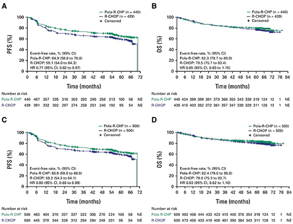 POLARIX研究纳入初治的、Ⅲ/Ⅳ期DLBCL患者,中位随访时间28个月后,发现与利妥昔单抗、环磷酰胺、多柔比星、长春新碱和泼尼松(R-CHOP)方案相比,Pola-R-CHP方案治疗患者的无进展生存期(PFS)有显著改善。
