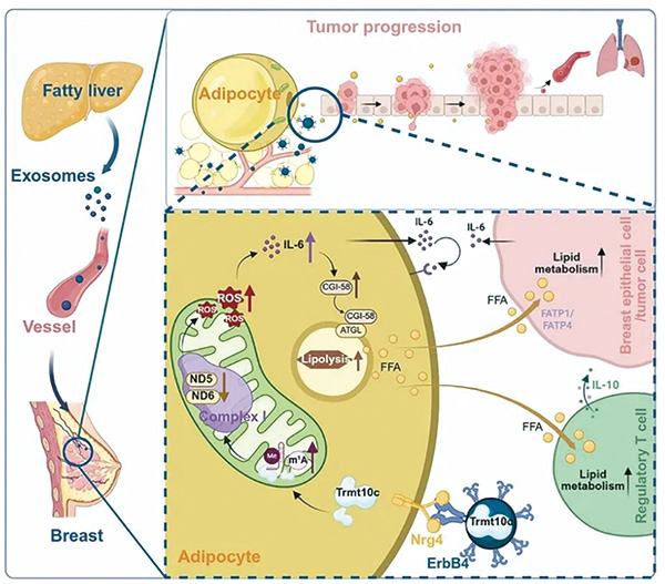 对乳腺脂肪细胞摄入脂肪肝外泌体后的促癌机制探讨发现脂肪肝外泌体携带的tRNA甲基转移酶Trmt10c,会进入线粒体,导致脂肪细胞线粒体mRNA中m1A水平升高(影响mRNA的稳定性,抑制蛋白表达),线粒体复合物Ⅰ亚基ND5和ND6蛋白的表达下调,进而增加线粒体活性氧的产生,促进IL-6的产生;IL-6通过增加CGI-58表达来激活ATGL,从而促进脂肪细胞的脂解作用,最终增强游离脂肪酸的释放;这些游离脂肪酸会被肿瘤细胞和调节性T细胞摄取,从而促进肿瘤进展。