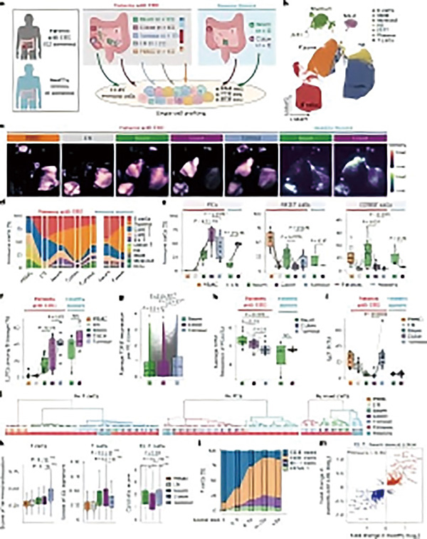 各组织间主要细胞亚群的组成和分布存在显著差异。PBMCs中富含T细胞和NK细胞,肿瘤引流淋巴结和回肠中富含B细胞,而肿瘤样本中髓系细胞富集,表明不同组织存在异质性免疫景观。