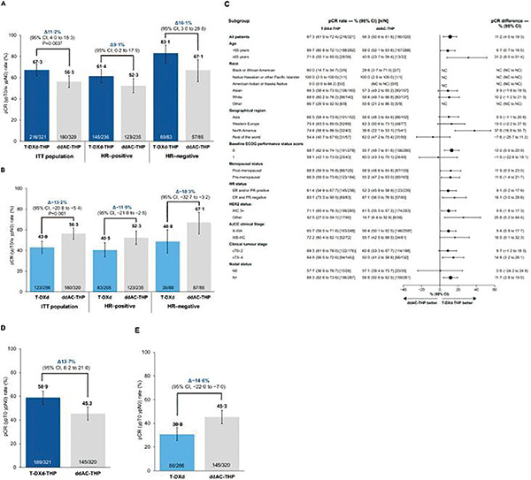 这项来自18个国家147个中心的开放标签的Ⅲ期试验将成年患者按1∶1∶1的比例随机分配至T-DXd组(8周期)、T-DXd-THP组(4周期T-DXd + 4周期THP)或ddAC-THP组(4周期ddAC + 4周期THP)。根据独立数据监测委员会的建议,T-DXd单药组提前停止入组。主要终点是pCR(ypT0/is ypN0;意向治疗人群)。次要终点包括无事件生存期(EFS;意向治疗人群)和安全性(安全性分析集)。