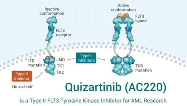 quizartinib是一种口服类型的、选择性的、第二代Ⅱ型FLT3抑制剂,对ITD和野生型FLT3具有高亲和力,早期临床试验显示单药治疗复发/难治性FLT3-ITD阴性AML患者时有活性。Ⅲ期试验QuANTUM-First显示,在新发的FLT3-ITD阳性AML患者中,相比安慰剂,将quizartinib添加至标准化疗并随后进行单药维持治疗,可显著延长生存期。