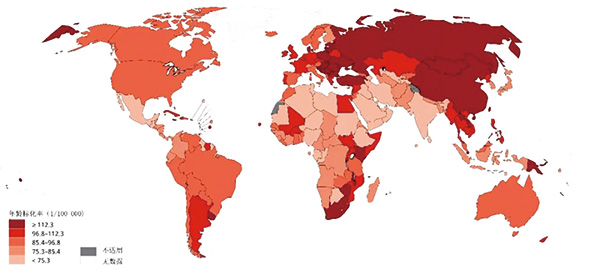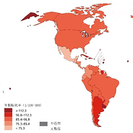 结果显示,2003~2017年,在大多数(>75%)国家的年轻成人中,13种癌症类型中的6种发病率增高,具体为甲状腺癌(中位AAPC为3.57%)、乳腺癌(中位AAPC为0.89%)、结直肠癌(中位AAPC为1.45%)、肾癌(中位AAPC为2.21%)、子宫内膜癌(中位AAPC为1.66%)及白血病(中位AAPC为0.78%)。