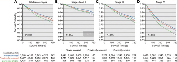 通过采用严谨的统计模型,并排除年龄、性别、癌症类型和分期等干扰因素后,分析结果显示,与从不吸烟者相比,当前吸烟者的死亡风险增加了35%,即使是既往吸烟者,其死亡风险也仍有13%的升高。在生存率曲线上,这一差距直观可见,两年总生存率,从不吸烟者为81.4%,既往吸烟者为79.4%,而当前吸烟者仅为76.4%。
