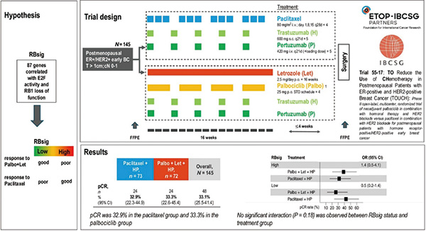 TOUCH是一项国际性、开放标签的Ⅱ期试验,入组对象为绝经后cT>1 cm、cN0或cN1、HR+/HER2+乳腺癌患者,被分配随机接受16周新辅助治疗:每周紫杉醇或哌柏西利联合来曲唑,两组均联合曲妥珠单抗+帕妥珠单抗(HP)。