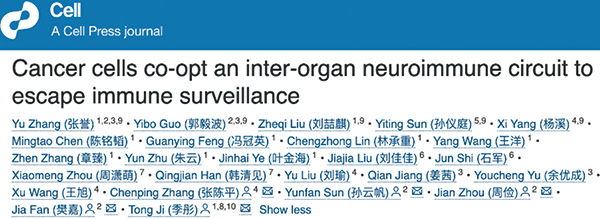 肿瘤与神经的互作是近期学界的研究热点,此前《自然》杂志背靠背发表两篇研究论文发现小细胞肺癌细胞可在脑内与神经元形成突触,借助电信号促进肿瘤生长。研究者旨在探讨肿瘤是否可通过神经网络调节远端组织/器官,实现免疫逃逸。