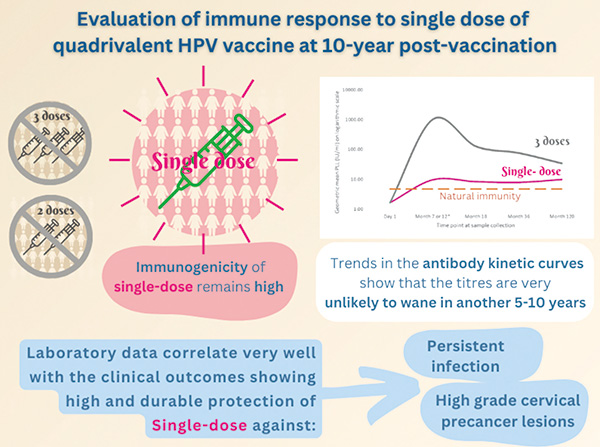 2021年时,一项印度研究显示,只接种一剂四价HPV疫苗对HPV 16和18型感染提供的10年保护效果与两或三剂相当。这可能有助于在医疗资源缺乏的国家和地区中,让更多女性从HPV疫苗中获益。哥斯达黎加的一项HPV疫苗试验的事后分析和肯尼亚的一项随机对照试验也得到类似结果。 (编译 王羽蒙)