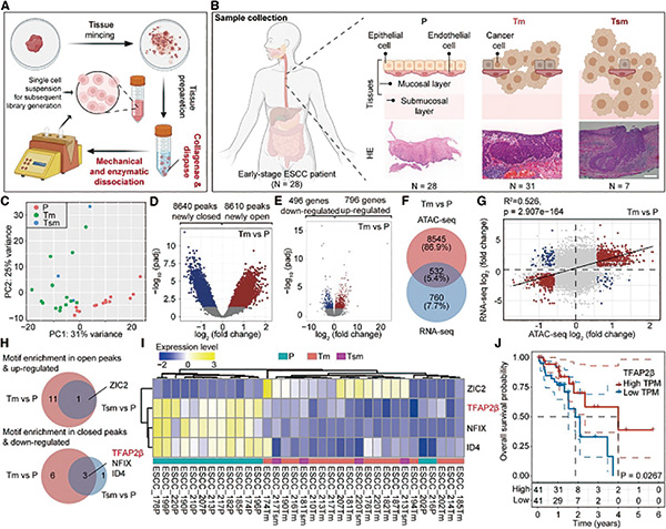 基于ATAC-seq和RNA-seq数据,研究者发现TFAP2β在Tm和Tsm中的表达水平均下降。而围绕TCGA数据库的分析显示,TFAP2β表达与食管癌预后呈显著负相关,提示TFAP2β有潜力成为早期食管鳞状细胞癌的预后生物标志物。后续围绕TFAP2β蛋白和转录的分析数据显示,TFAP2β的mRNA和蛋白水平均从癌旁、早期到晚期逐渐降低。