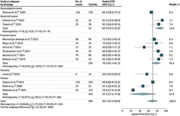 各癌种汇总的1年或2年STFS率为69.7%(95%CI 57.4%~ 80.9%)。肾细胞癌中STFS率最高(87.0%,95%CI 76.2%~95.2%),其次是前列腺癌的(78.1%,95%CI 67.4%~87.3%),其他癌症类型中的较低。