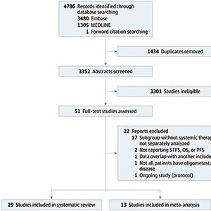 在因合并症、患者偏好或对不良事件担忧而推迟系统治疗的寡转移癌症患者中,靶向转移灶的SBRT或为可行的策略。迄今为止,支持该策略的证据尚未被全面评估。为了评估单纯SBRT后不同类型癌症寡转移患者的无系统治疗生存期(STFS),并量化不良事件、生活质量及肿瘤学结局,该项系统综述和荟萃分析于2024年7月10日由两位独立评审员基于PRISMA标准系统检索了PubMed和EMBASE数据库中2009年以后发表的、符合条件的潜在研究,并进行了正向和反向引用追踪以识别出更多的相关研究。