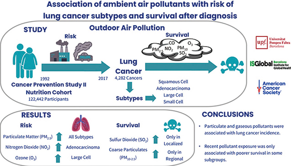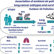 环境细颗粒物(PM2.5)的空气污染与肺癌风险相关。然而,人们对空气污染与肺癌亚型相关性的了解甚少,也不清楚空气污染对肺癌生存率是否有影响。研究者将美国癌症协会癌症预防研究-Ⅱ营养队列(122 442例)与居民的年度颗粒物和气体污染物浓度进行了关联,采用扩展Cox回归方法建模评估随时间变化的污染物暴露与肺癌亚型和诊断后死亡风险(污染物浓度均差每变化5个百分点的风险比及95%置信区间)的情况。研究估算的各种空气污染物包括PM2.5、粗颗粒物(PM10)、臭氧(O3)、二氧化硫(SO2)、二氧化氮(NO2)和一氧化碳(CO)。
