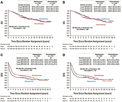 2007年3月至2019年1月,分别有151例和149例患者被随机分配至辅助化疗组和单纯肝切除术组。对无病生存患者的中位随访时间为7.7年时,两组分别有54例(35.8%)和51例(34.2%)患者死亡(HR=1.07,95%CI 0.73~1.57)。