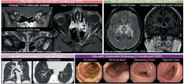 在西达基奥仑赛治疗者中,最常见的CirAE为脑神经麻痹(8%)、肠炎(5.6%)、帕金森病(4.8%)和关节炎(1.6%),而迟发性免疫效应细胞相关神经毒性综合征(ICANS)、脑病变和周围神经病变则较少见(各0.8%)。2例患者在西达基奥仑赛治疗下出现多次CirAE,其中1例74岁男性患者发生3例次不同的CirAE。ide-cel治疗中唯一被观察到的CirAE为肺炎。