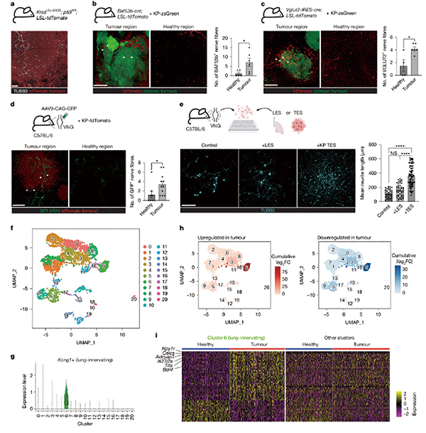 研究者在Kras G12D和Trp53缺失驱动的肺腺癌小鼠(KP小鼠)中通过三维组织透明化成像与神经示踪技术发现,肺腺癌肿瘤团块内部被大量TUBB3+神经纤维穿透并包裹,神经密度显著高于周围正常肺组织。遗传学标志与 AAV 介导的神经末梢示踪定位肿瘤中富集的神经主要为来源于迷走神经结节( vagal nodose ganglia )的 VGLUT2 + 感觉神经 。 体外功能实验发现,肿瘤细胞通过分泌神经营养因子(如 NGF),促进这类感觉神经的末梢生长,使其成为连接肿瘤与中枢神经系统的重要感知节点。