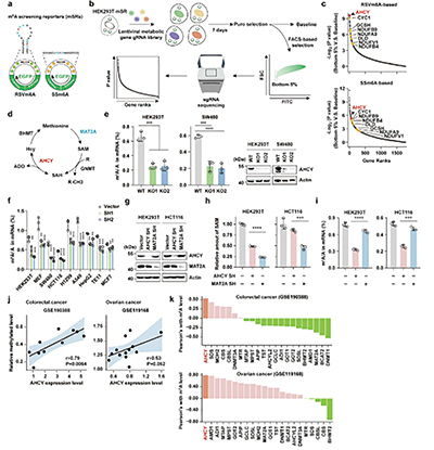 研究者设计了一套筛选系统,将一段可被m⁶A修饰的特异性序列(GGACU)嵌入环状RNA中,该序列的甲基化状态直接决定下游绿色荧光蛋白(GFP)的表达水平——m⁶A水平越高,荧光信号越强。将该系统与覆盖1700余个代谢基因的CRISPR-Cas9敲除文库相结合,便可通过筛选荧光信号异常的细胞,高通量鉴定调控m⁶A的代谢因子。