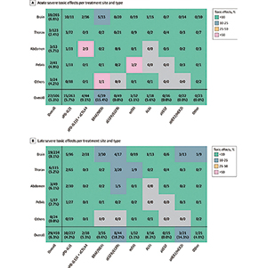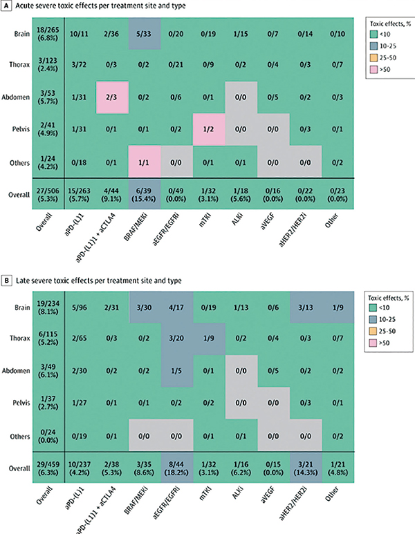 在430例次(83.7%)SRT中,生物制剂抗癌治疗于SRT前开始给药,而392例患者中有71例(18.1%)在SRT期间暂停了生物制剂抗癌治疗。在506例次治疗中,严重(≥3级)急性不良事件有27例次(5.3%),其中3例次为5级事件;在459例次治疗中,严重(≥3级)迟发性不良事件有29例次(6.3%),其中2例次为5级事件。SRT联合连续的生物制剂抗癌治疗,与增加的严重的急性/迟发性不良事件无关(OR=2.32,95%CI 0.87~6.22)。