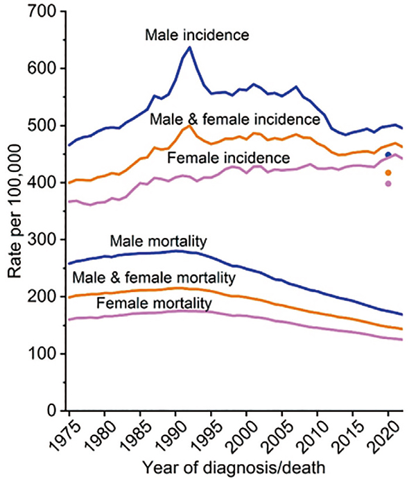 癌症归因死亡率在2023年开始持续下降;主要因为吸烟减少、早期发现和治疗改善,自1991年以来避免了480万例癌症死亡事件。这些干预措施在提高5年相对生存率方面也很明显,所有癌症患者的5年相对生存率从20世纪70年代中期的49%和20世纪90年代末的64%提升到2015~2021年具有里程碑意义的70%,其中在区域性疾病患者中的达到了69%,在远处转移性疾病患者中的达到了35%,而在20世纪90年代中期时的则依次为63%、54%和17%。